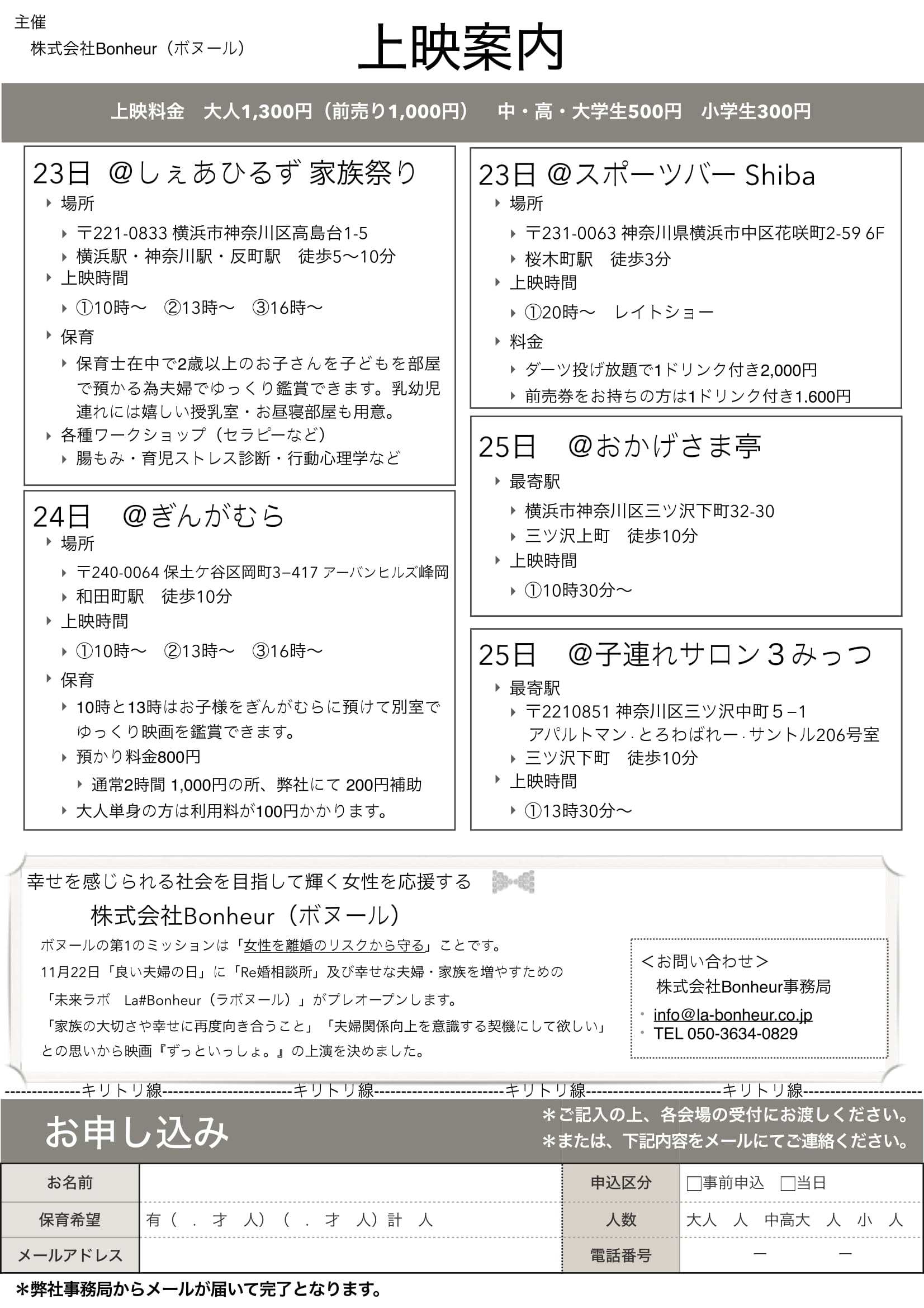 Bonheurは創業イベントとして『家族の大切さや幸せに再度向き合うこと』を映画を通して感じて頂き、夫婦・家族関係向上を意識する契機にして頂きたい、との思いから 映画「うまれる。」の続編「ずっといっしょ。」の上演を決めました。